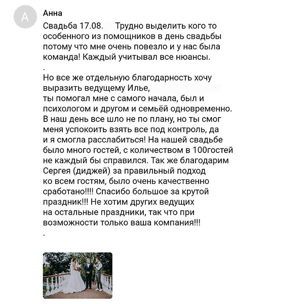 Илья, ты просто нереально крутой какой‑то ведущий! Все было АБСОЛЮТНО так, как было в наших мыслях и желаниях. Свадьбы прошла на одном дыхании. КАЖДЫЙ гость к нам потом подошёл и сказал, он остался очень доволен,